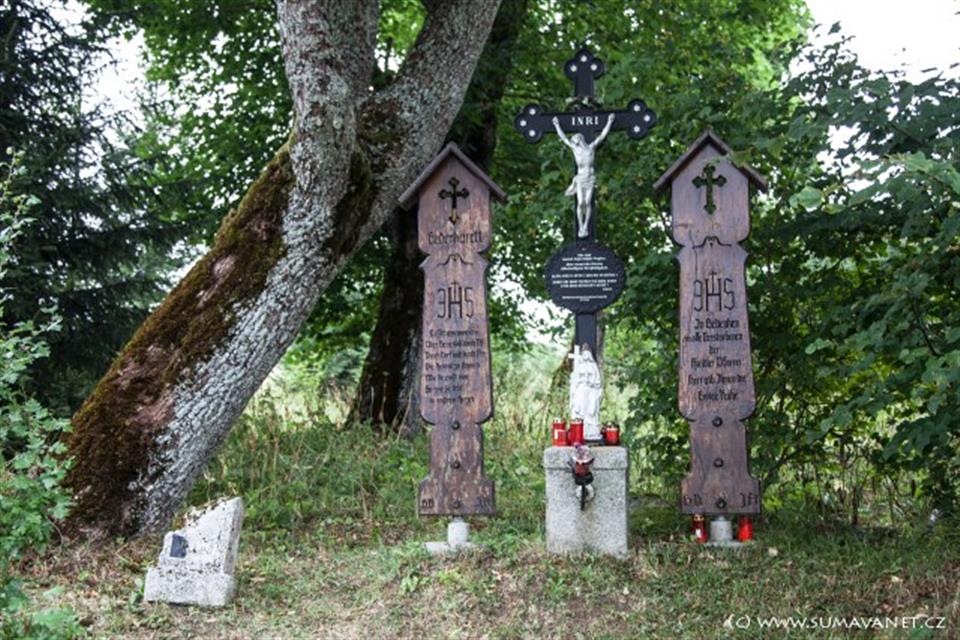 Zaniklá obec na svahu hory Javorná, kaplička, kříž smíření, památník obětem americké armády, památné stromy.