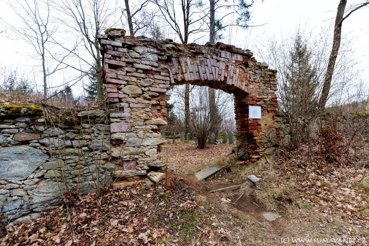 Ohradní zeď z lomového neomítaného kamene o nestejné výšce od 0,2 do 1,5 m, místy zcela rozvalena. Brána vyzděna ze smíšeného zdiva. Otvor ukončený segmentem oblouku, segment vyzděný z cihel, vrata chybí.